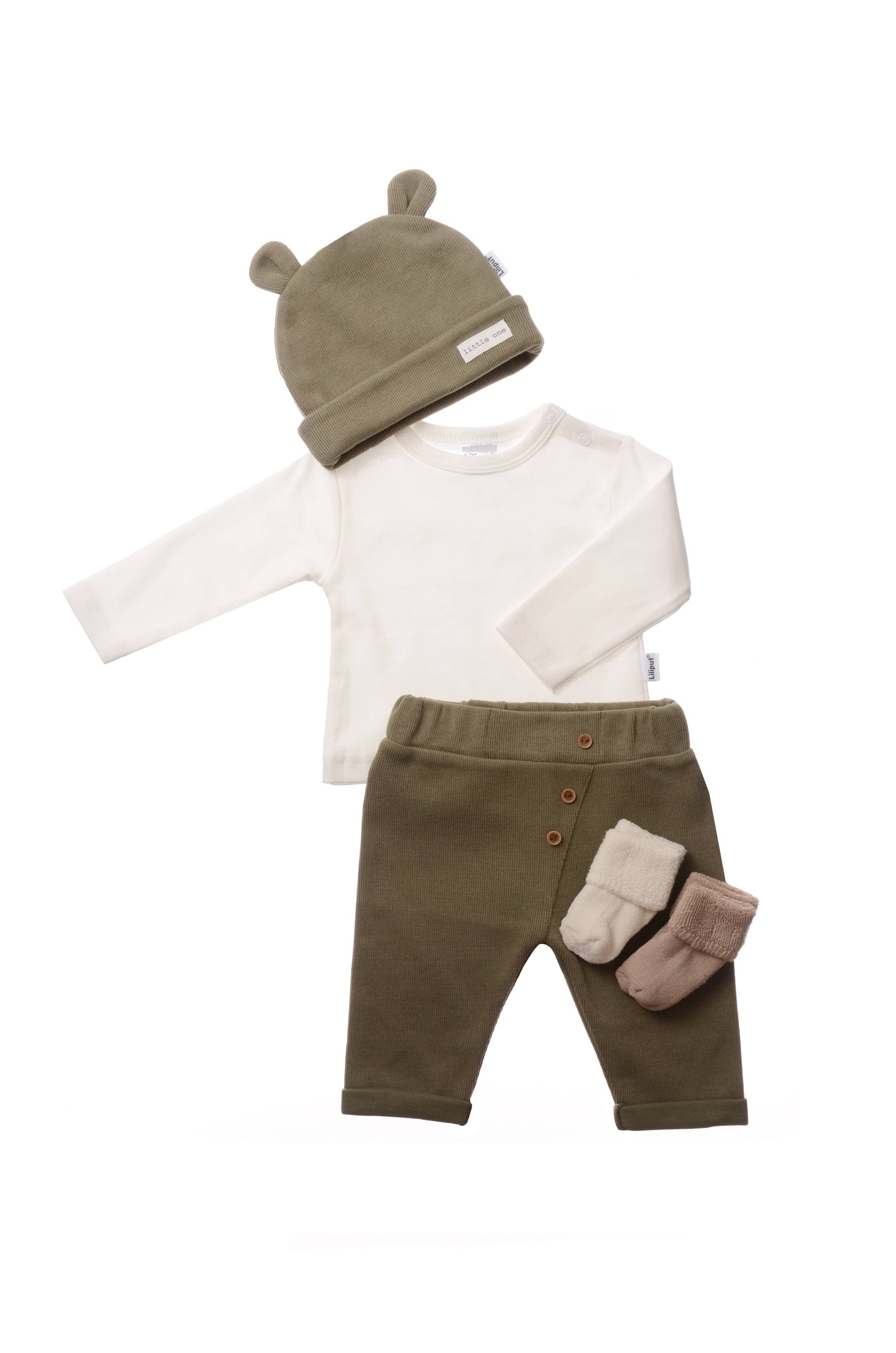 🧶Composition : - T-shirt manches longues : 100 % coton - Pantalon et bonnet côtelés : 80 % coton, 20 % polyester - Chaussettes : 80 % coton, 17 % polyester, 3 % élasthanne Lavage en machine à 40°C.