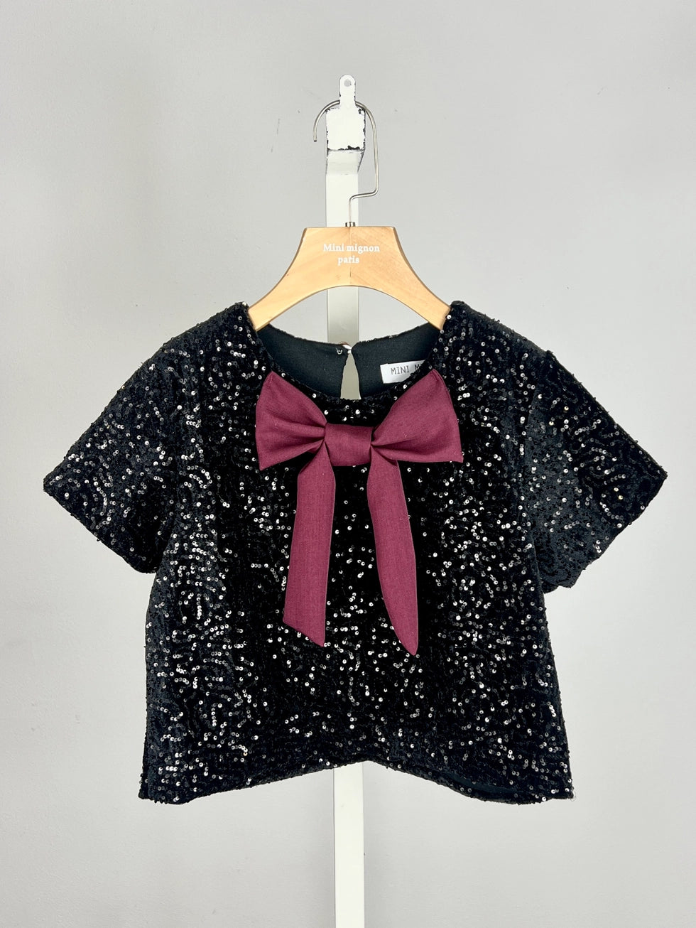 Ce top festif incarne l'audace et la séduction. Le top en velours rehaussé de sequins scintillants capture la lumière à chaque mouvement, tandis que le nœud avant ajoute une touche de coquetterie irrésistible. Un look qui ne passe pas inaperçu, idéal pour les occasions où vous voulez briller et affirmer votre style sans compromis.