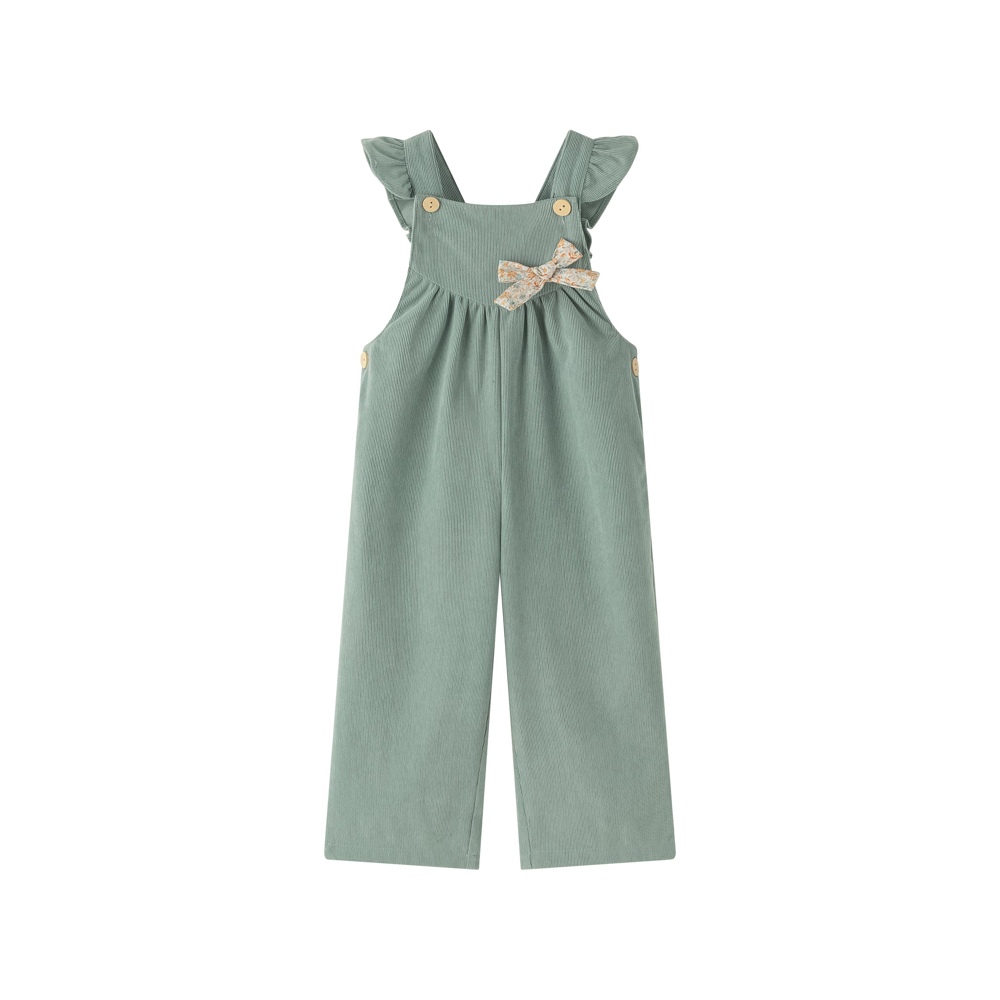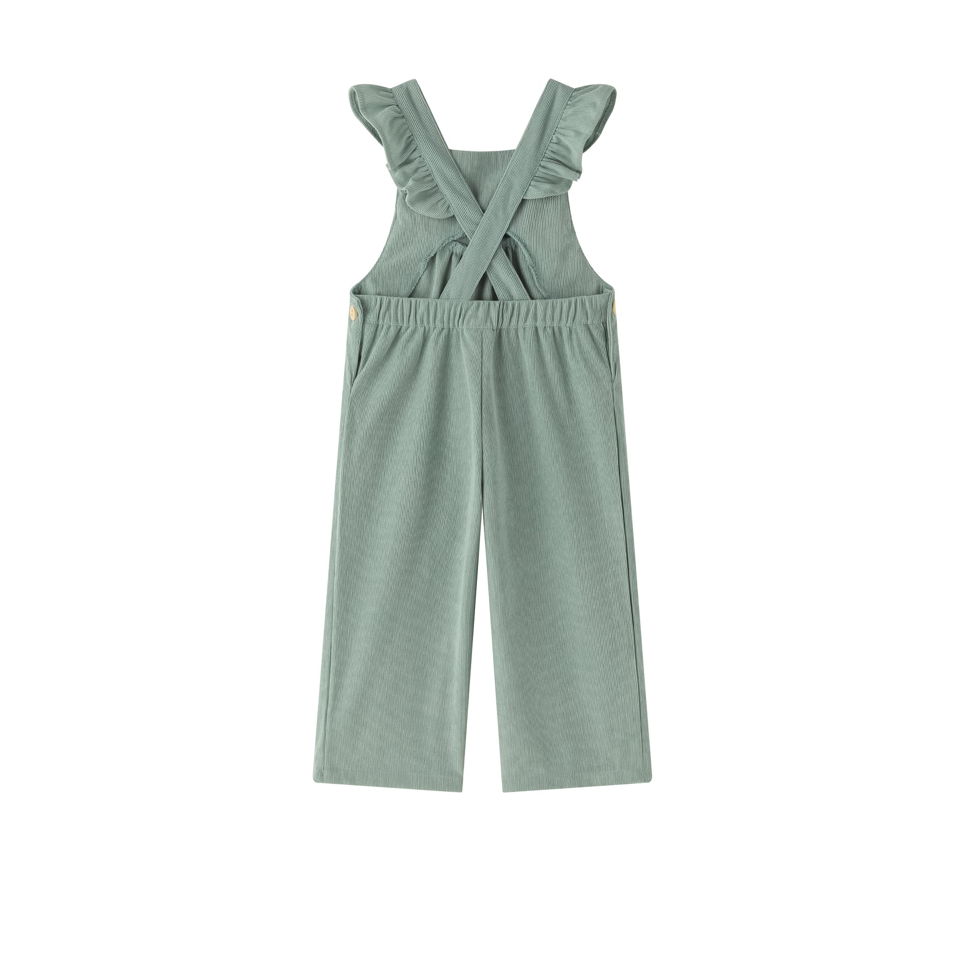 Cette combinaison vert d'eau se distingue par ses nœuds délicats sur la poitrine, ses bretelles réglables grâce à des boutons en bois et ses volants élégants. Sa coupe ample associée à une taille élastiquée offre un confort optimal et une silhouette décontractée maîtrisée.