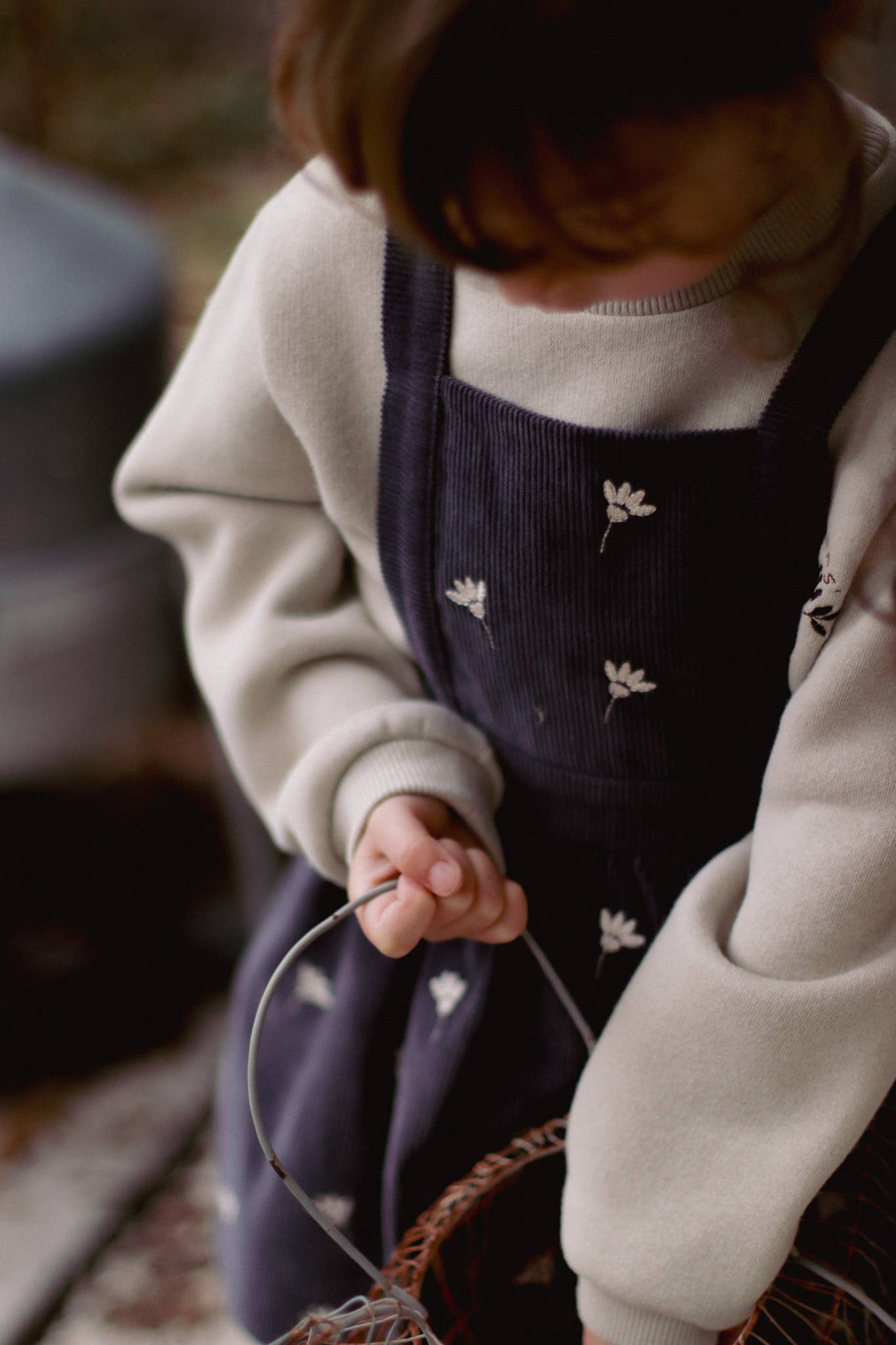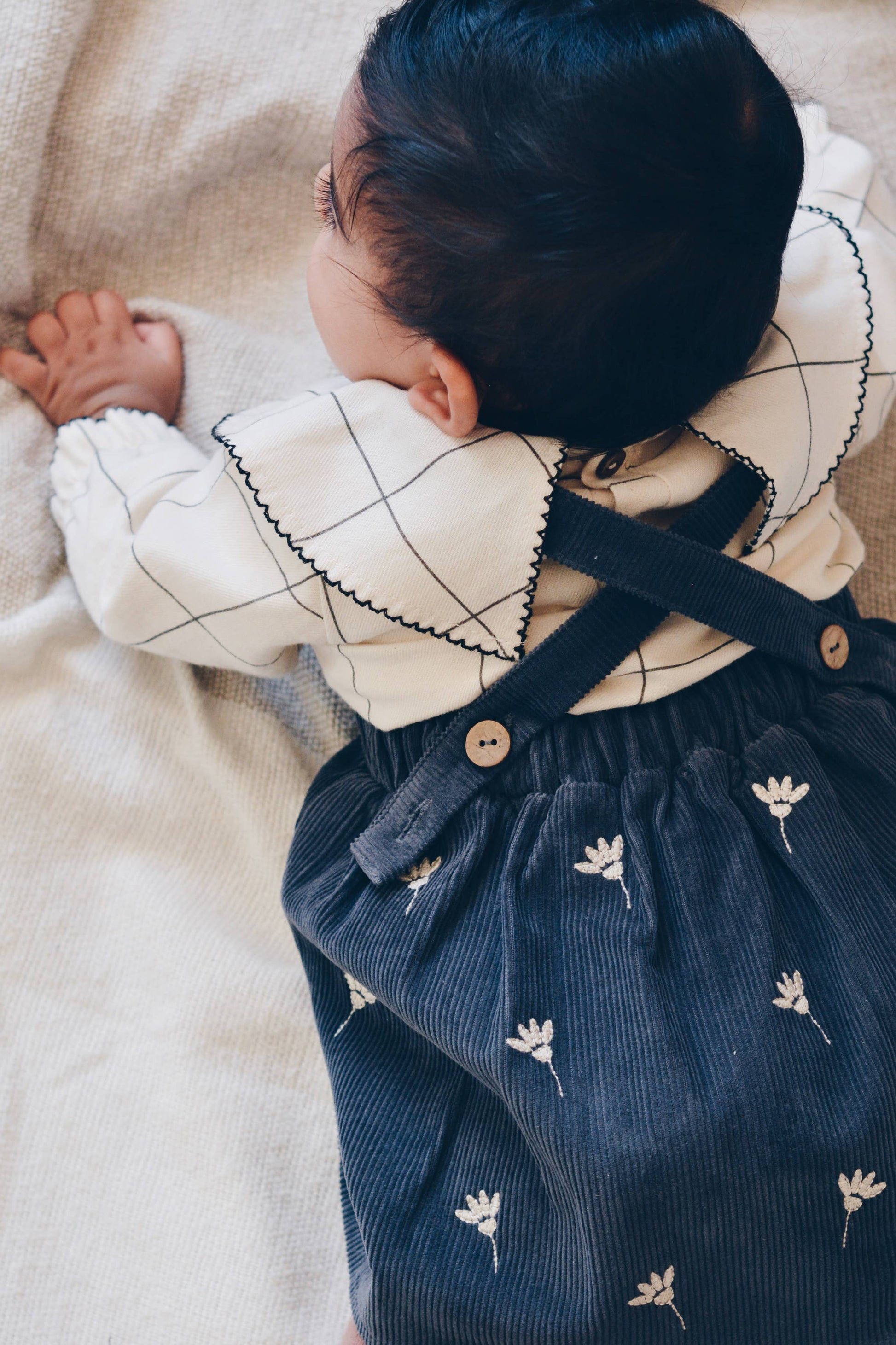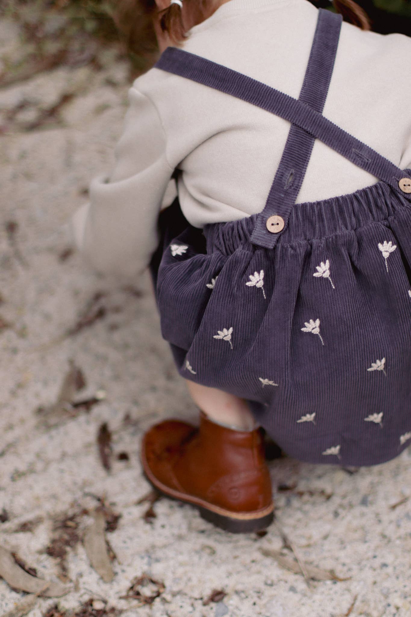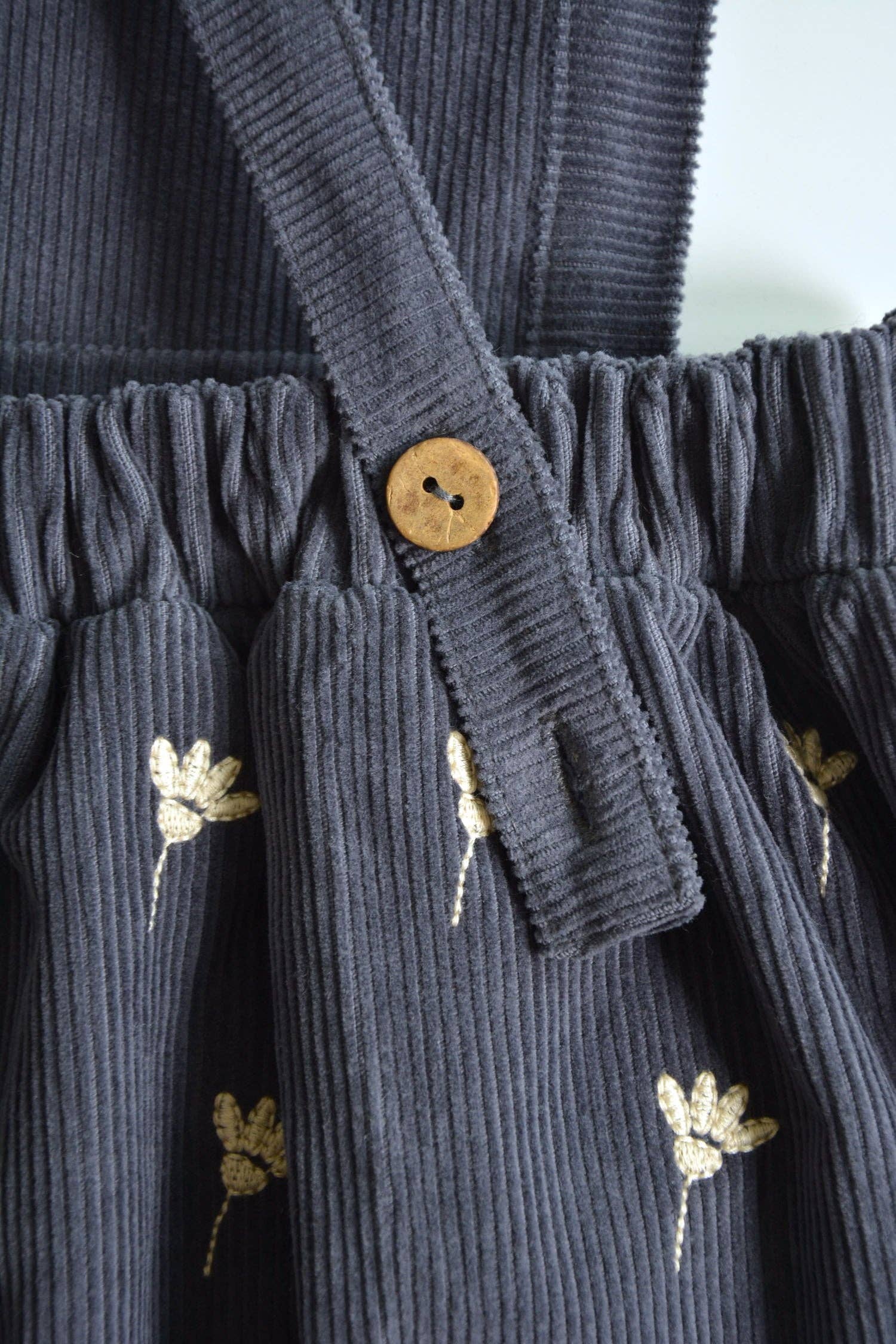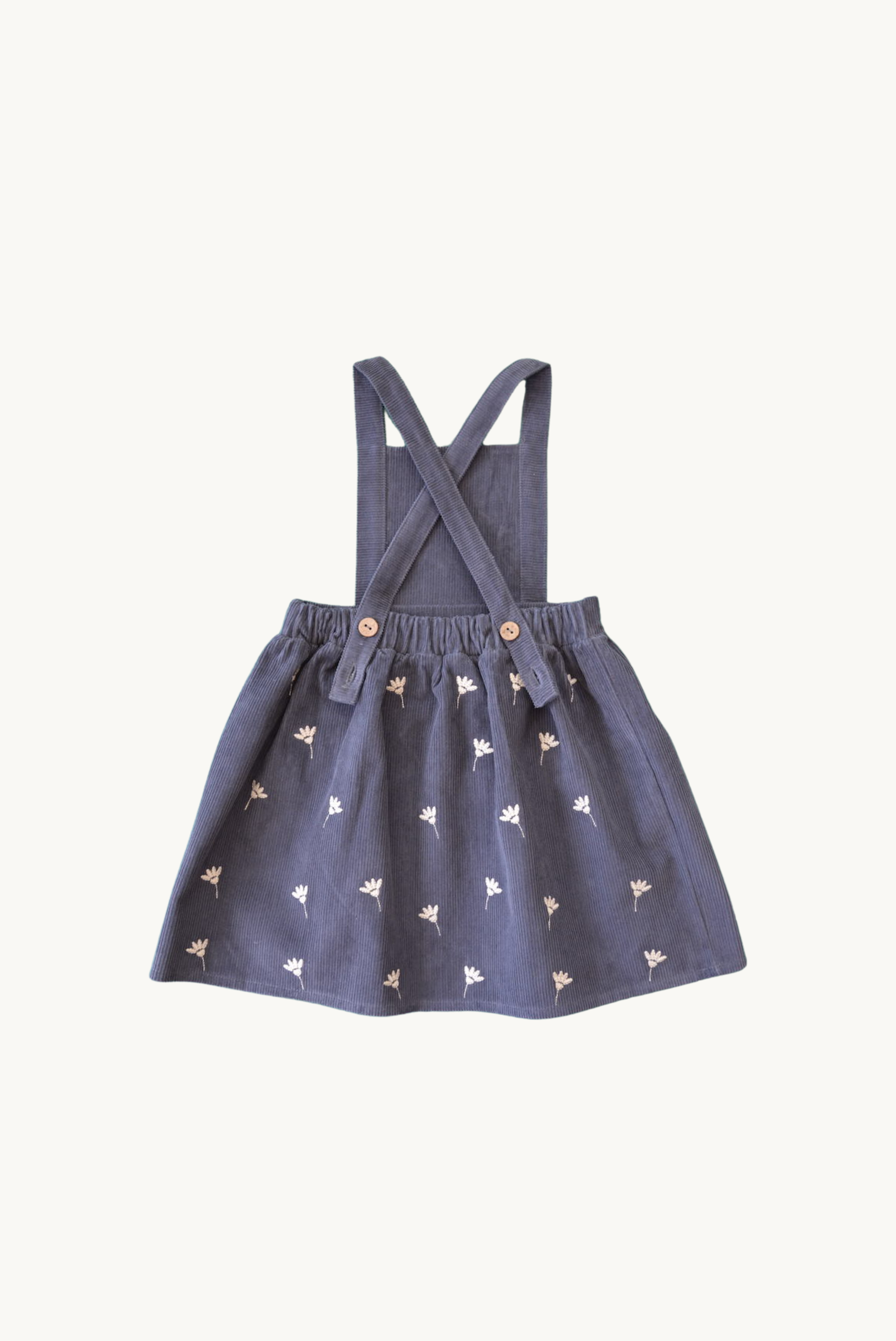 Robe en velours côtelé 100 % coton, ornée d’un motif brodé de fleurs blanches. Dotée de bretelles ajustables grâce à deux boutons en noix de coco situés à l’arrière. Conçue avec soin en Turquie.